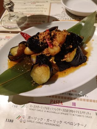 限定のメニューのなすとニンニク料理。カロリー抑え目っぽくてよかったです。