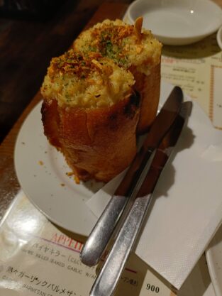 ガーリックトースト。この店は神奈川中心に展開されていますが、ニンニクを素直に使うタイプのお店です。