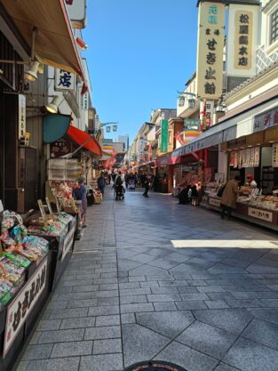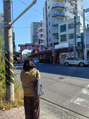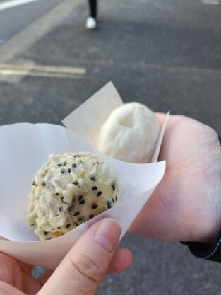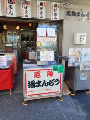 川崎大師までの道で揚げまんじゅうをいただきます。美味しかった。
