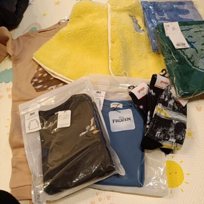 ヘビー服はポンチョやロンパース、女児向けワンピースもありました〜。550円。 100以上のサイズは550円以上したかな。 あとは靴下やタオルも。買ってないけど靴、コップ、サンダル、キーホルダーなどもありました。